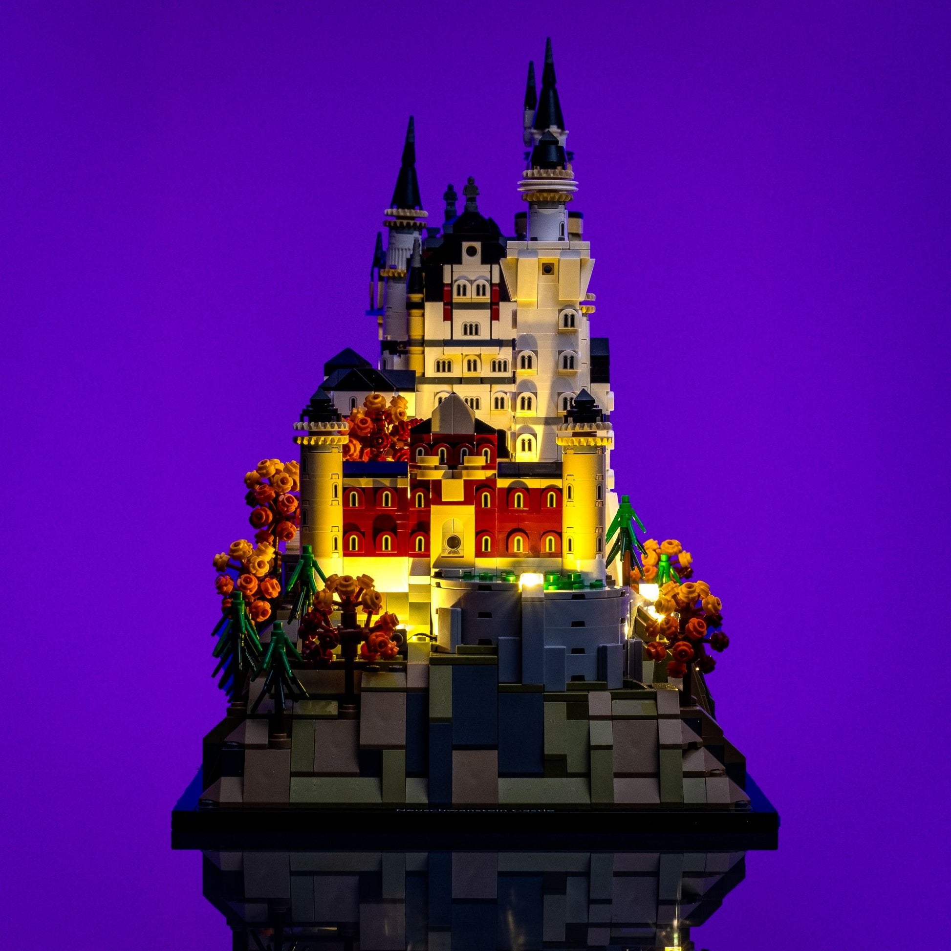 Bring the beauty of Bavaria’s most famous landmark to life with an elegant Light My Bricks™ Light Kit for the LEGO® Architecture Neuschwanstein Castle 21063. Inspired by the real castle’s dramatic nighttime façade, twelve warm white LEDs are discreetly placed to bathe every wall in a soft golden glow. Ten spotlights shine upward from the treeline, while two more illuminate the courtyard, ensuring the entire model is beautifully lit from every angle. Perfect for 360° display, this refined lighting design captures the romance and grandeur of Neuschwanstein in miniature form.