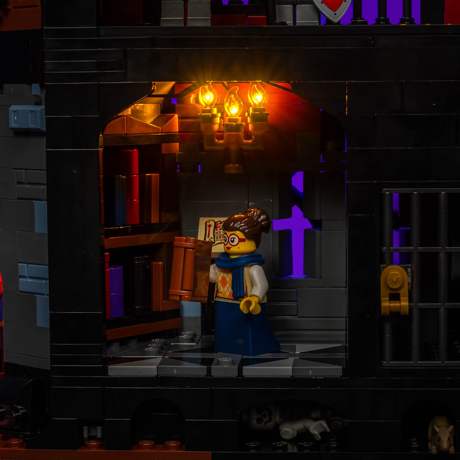 Bring a chilling new atmosphere to LEGO® Bricklink® Adventure in Transylvania 910049 with a Light My Bricks™ light kit designed to deepen the set’s spooky character without overwhelming its gothic charm. Warm flickering candlelight glows through the interior rooms, giving the castle a sense of life, mystery and hidden stories unfolding behind every wall. Eerie reds and violets gather beneath the bridge, around the archway and through the towers, casting the whole build in a haunting, otherworldly ambience that feels perfectly at home in Transylvania. Soft golden lantern light adds contrast and warmth, balancing the darker tones while drawing out the set’s rich details. From above, cool white rooftop spotlights create the effect of stormy moonlight pouring over the structure, adding drama from every angle and turning the model into a striking display piece. Whether admired on its own or among a wider fantasy collection, this kit gives the set a beautifully cinematic after-dark presence.