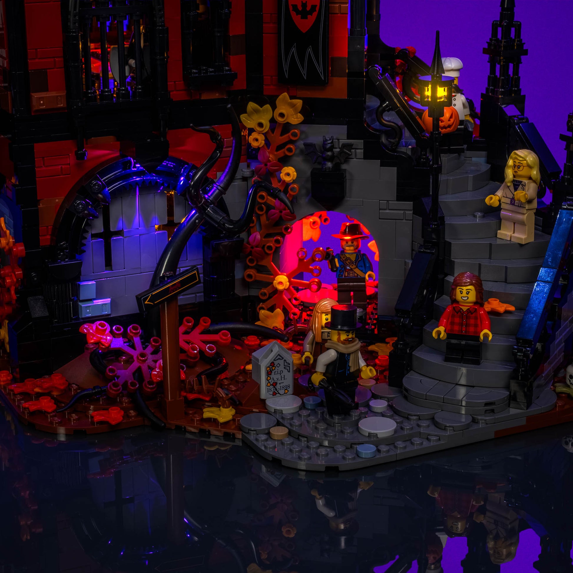Deep red lighting beneath the bridge and within the towers blends with violet accents to create an eerie focal point that strengthens the set's spooky, gothic personality.