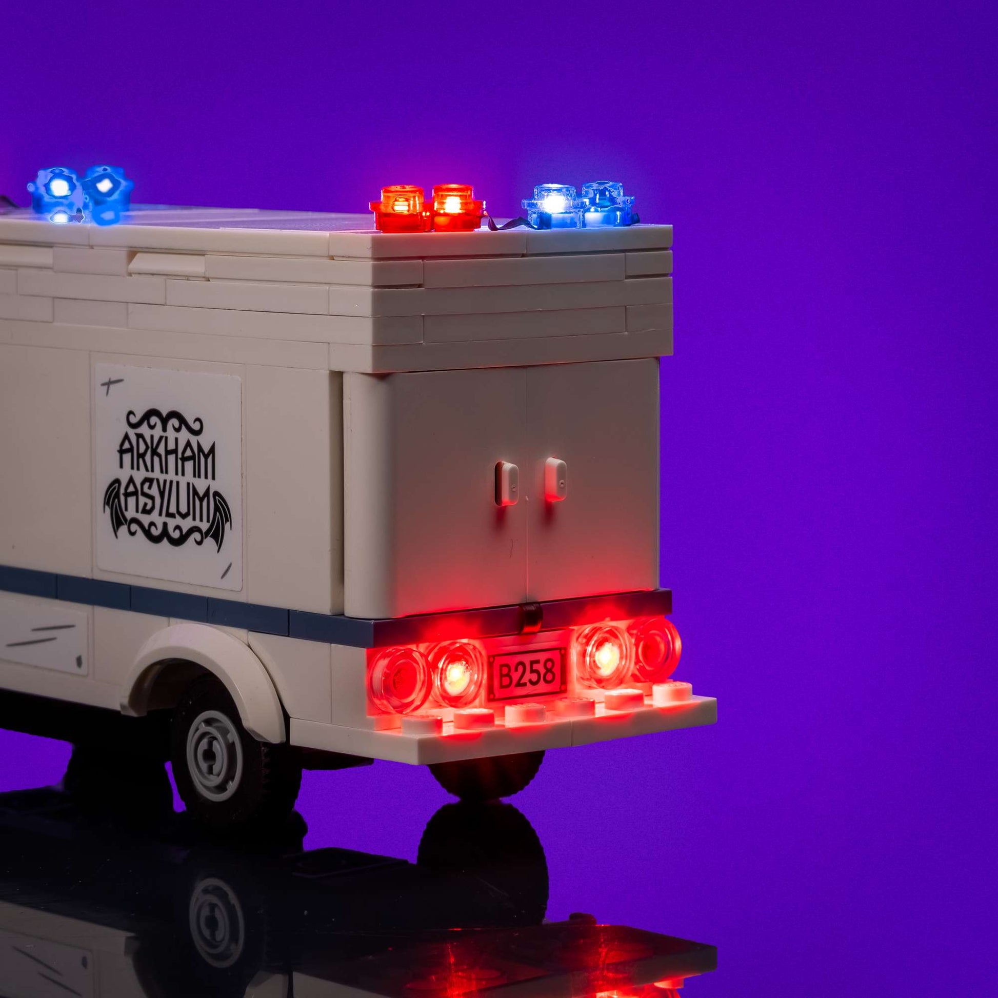 Hiding our Flux Pack inside the back, the Arkham Asylum Ambulance can be placed wherever it needs to go. With the dimming function, the rotating lights can even turn off!
