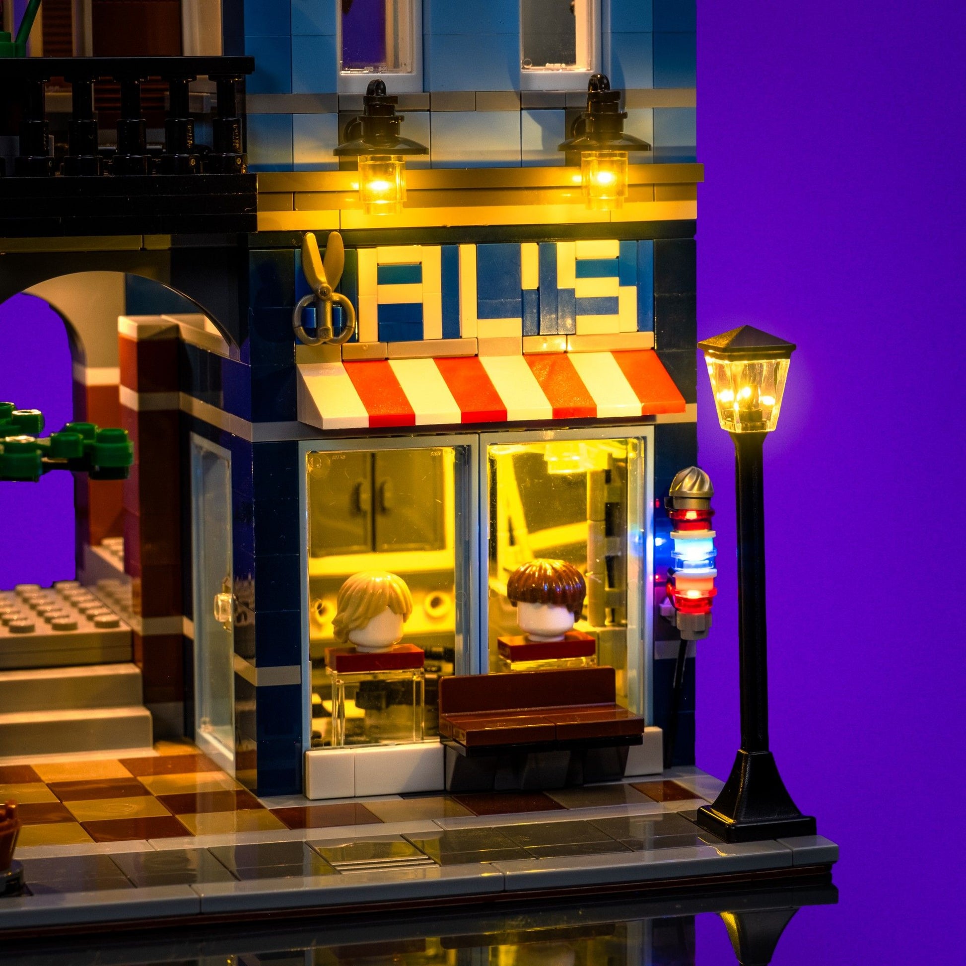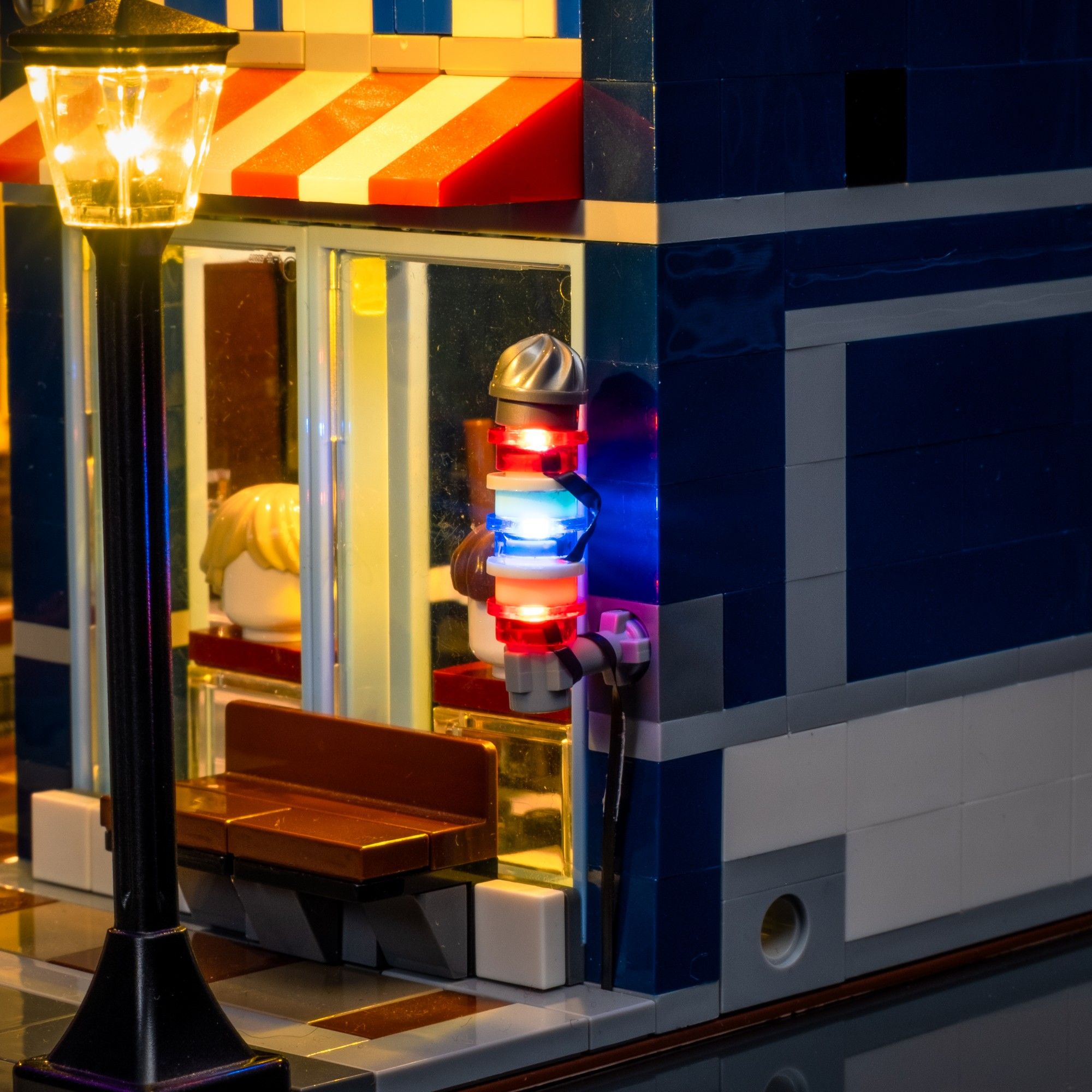 Step back into classic noir with a custom Light My Bricks™ Light Kit for the LEGO® Creator Detective’s Office 10246, the very first set we ever brought to life with lights. Warm white LEDs illuminate the interiors, while our signature lamp posts and glowing yellow lanterns create a vintage streetscape straight out of the 1940s. The iconic POOL sign and barber’s pole now feature a rotating string effect for extra realism, while carefully placed lights on the barber shop wall sconces and detective’s desk highlight the story-rich details inside. With Flux Touch Plates for easy level removal, this kit blends playability with display perfection, making the Detective’s Office shine brighter than ever.