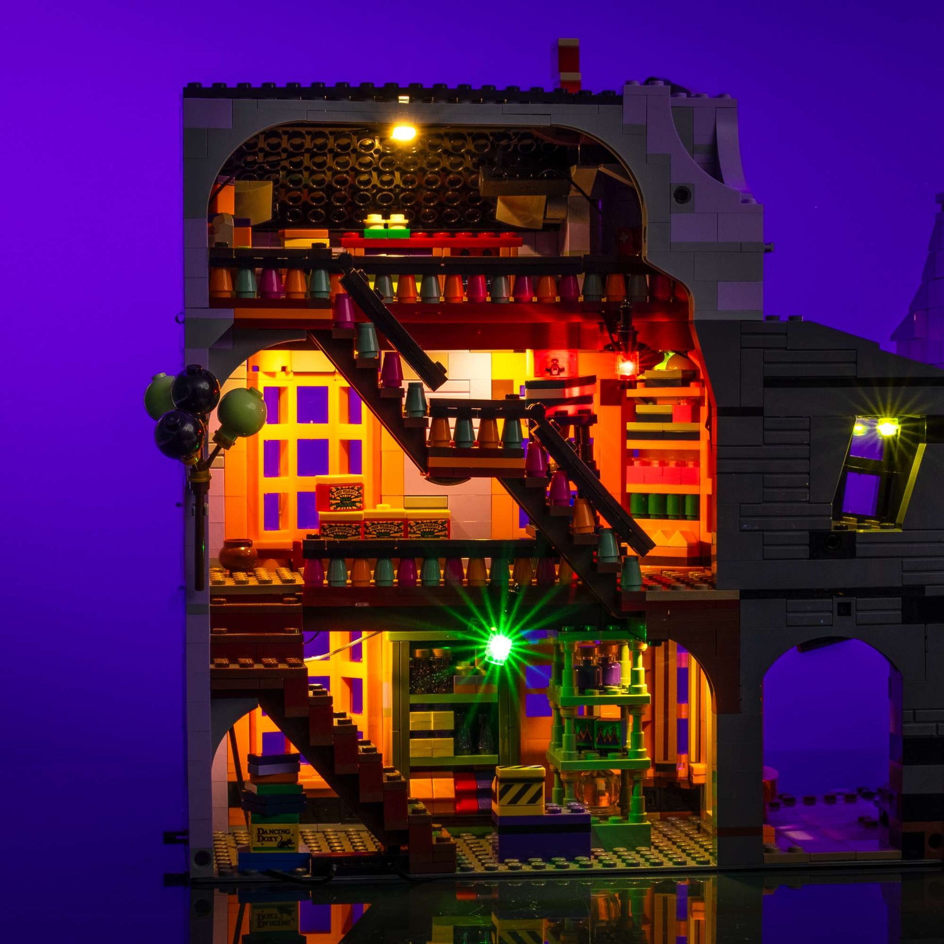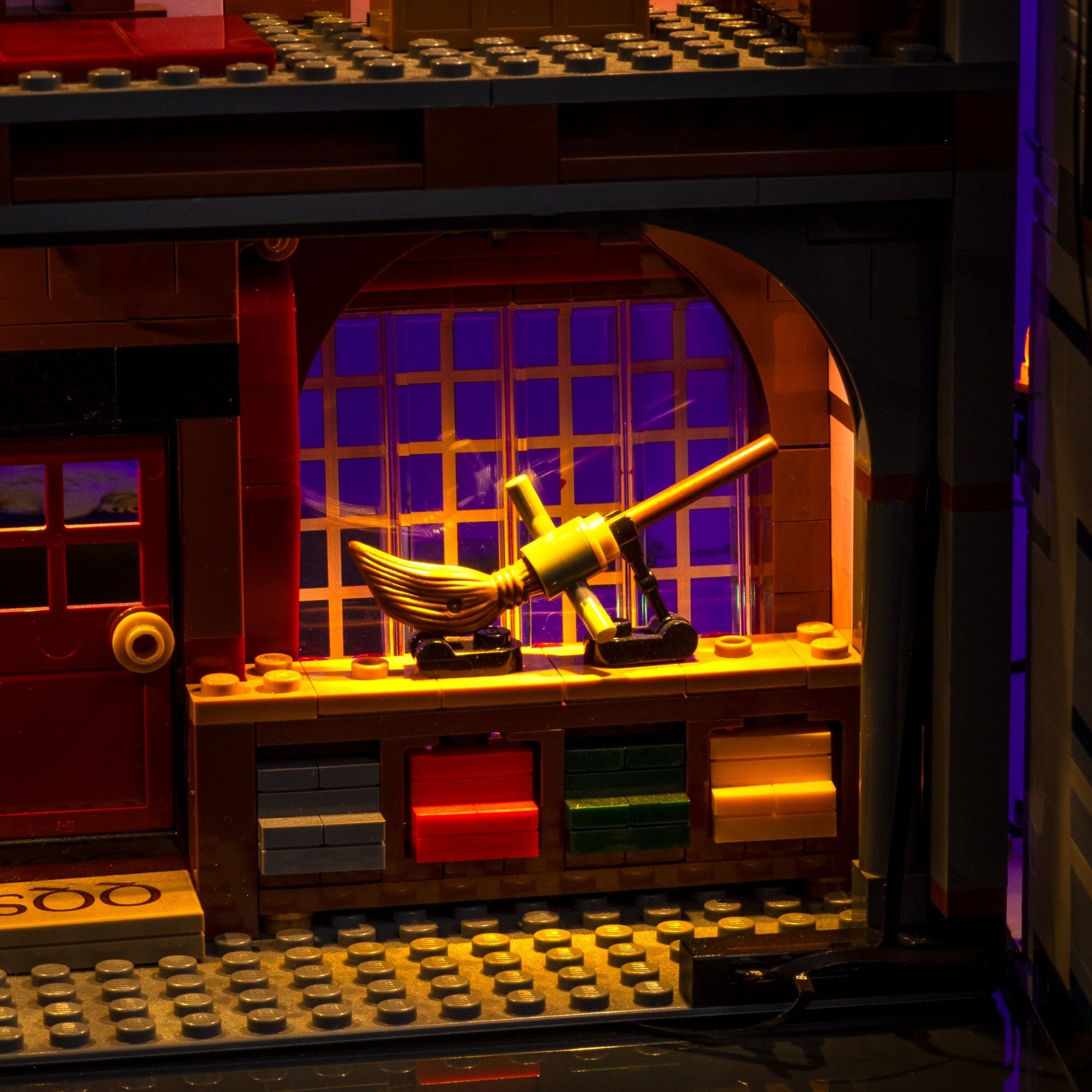 Step into the magical hustle of Diagon Alley™ with a custom Light My Bricks™ light kit for the LEGO® Diagon Alley™ 75978 set, designed to reflect the vibrant charm and cinematic authenticity of the wizarding world. Every shop—from Ollivanders to Weasleys' Wizards Wheezes—is thoughtfully lit. This kit highlights iconic features like the flickering candles of Scribbulus, the golden glow on the Nimbus 2000, and the colour changing pops and bangs inside the joke shop. The cobbled street is brought to life with lanterns casting a timeless glow, while subtle lighting details like the spooky Knockturn Alley window add depth and intrigue. Whether you're recreating your favorite scenes or showcasing your build, this lighting kit transforms Diagon Alley into a living, magical masterpiece.