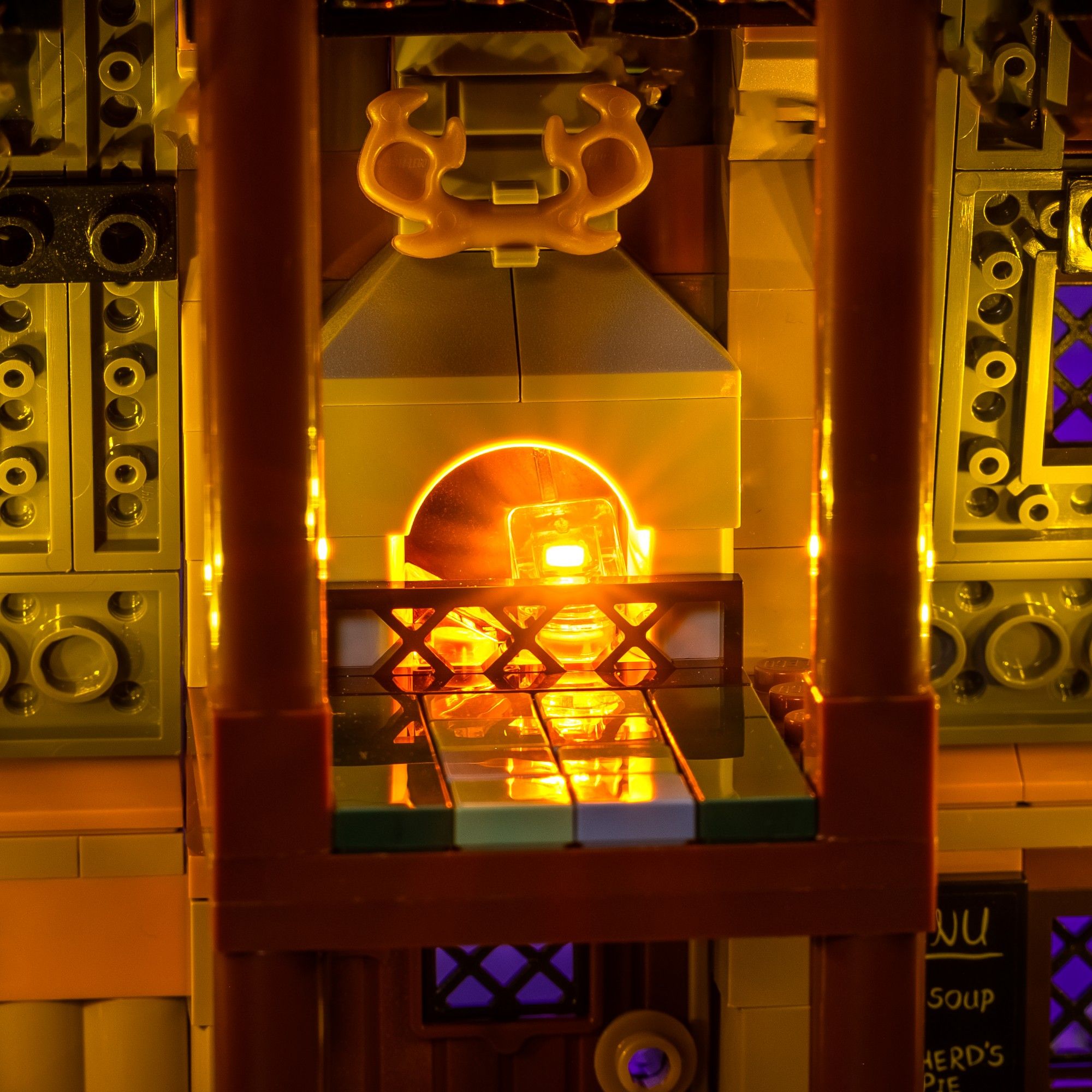 The Three Broomsticks Inn features two fireplaces, each of which we've lit with our Flickering Effect Astro Lights to provide the interior with a comforting orange glow.