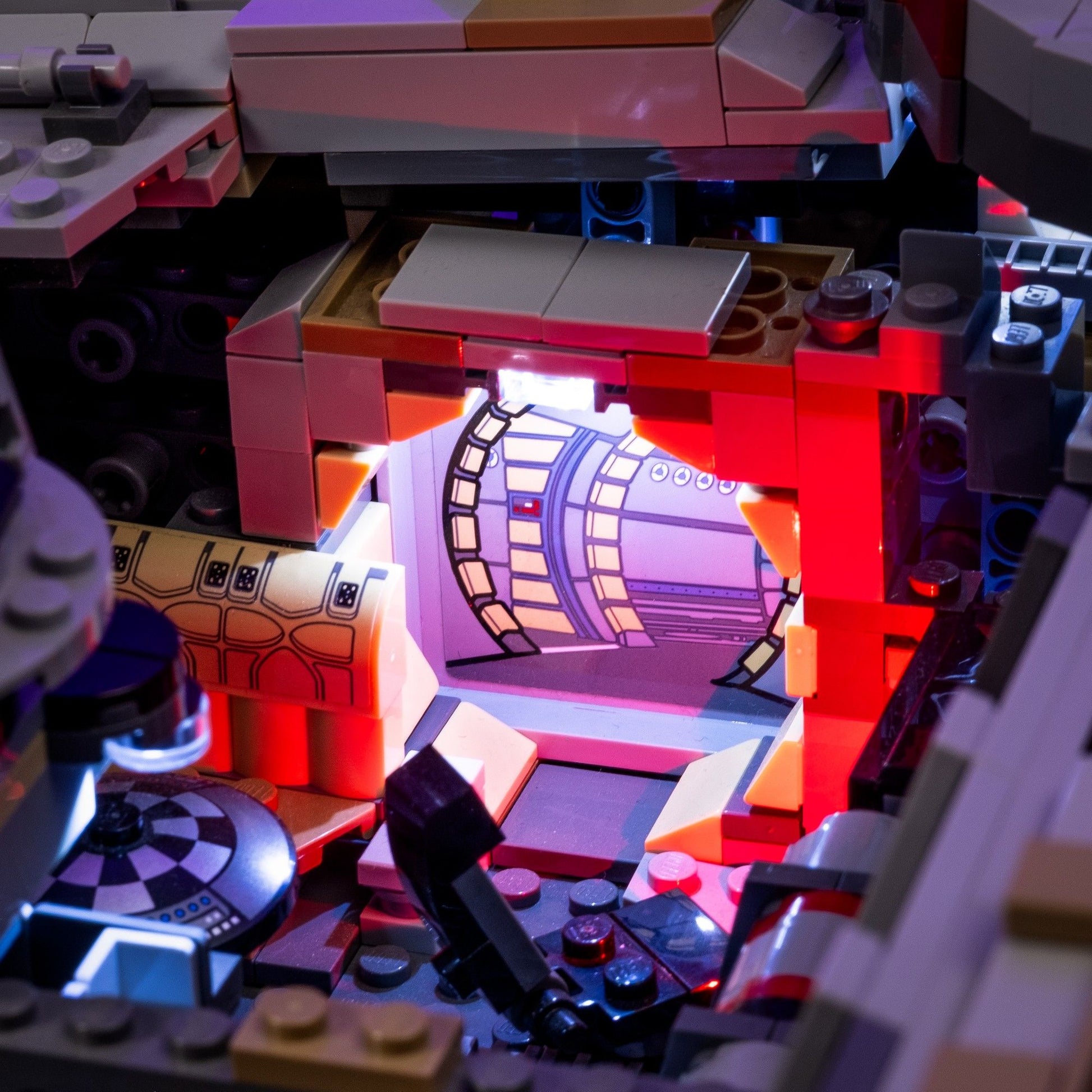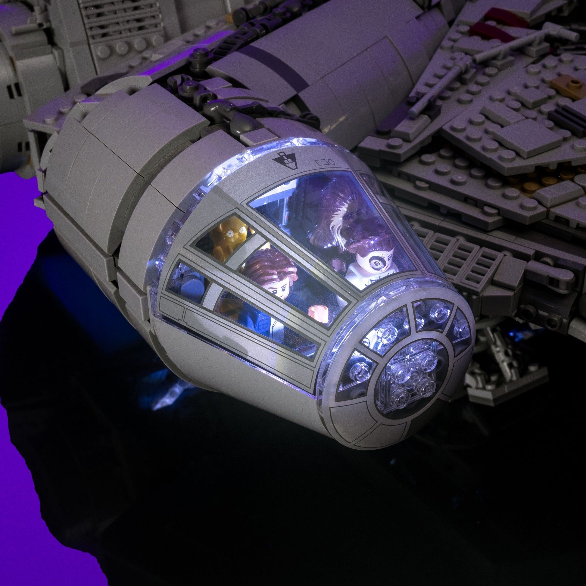 There are 20 lights included in this galactic light kit, placed perfectly throughout the set to highlight the iconic details of your UCS Millennium Falcon. From the cockpit, to the entrance ramp and the gunner seats, the interior has been masterfully lit with a range of our Astro Lights. Additional features throughout the Falcon have been lit up to perfectly match the scenes from the Star Wars Saga, and don't prevent the playability of the set if you choose to remove the panels of the spaceship. And of course, we haven't forgotten the most iconic detail of this Corellian freighter: the engine, where we've placed 6 of our custom Flare Lights, which give off a powerful glow identical to the films.