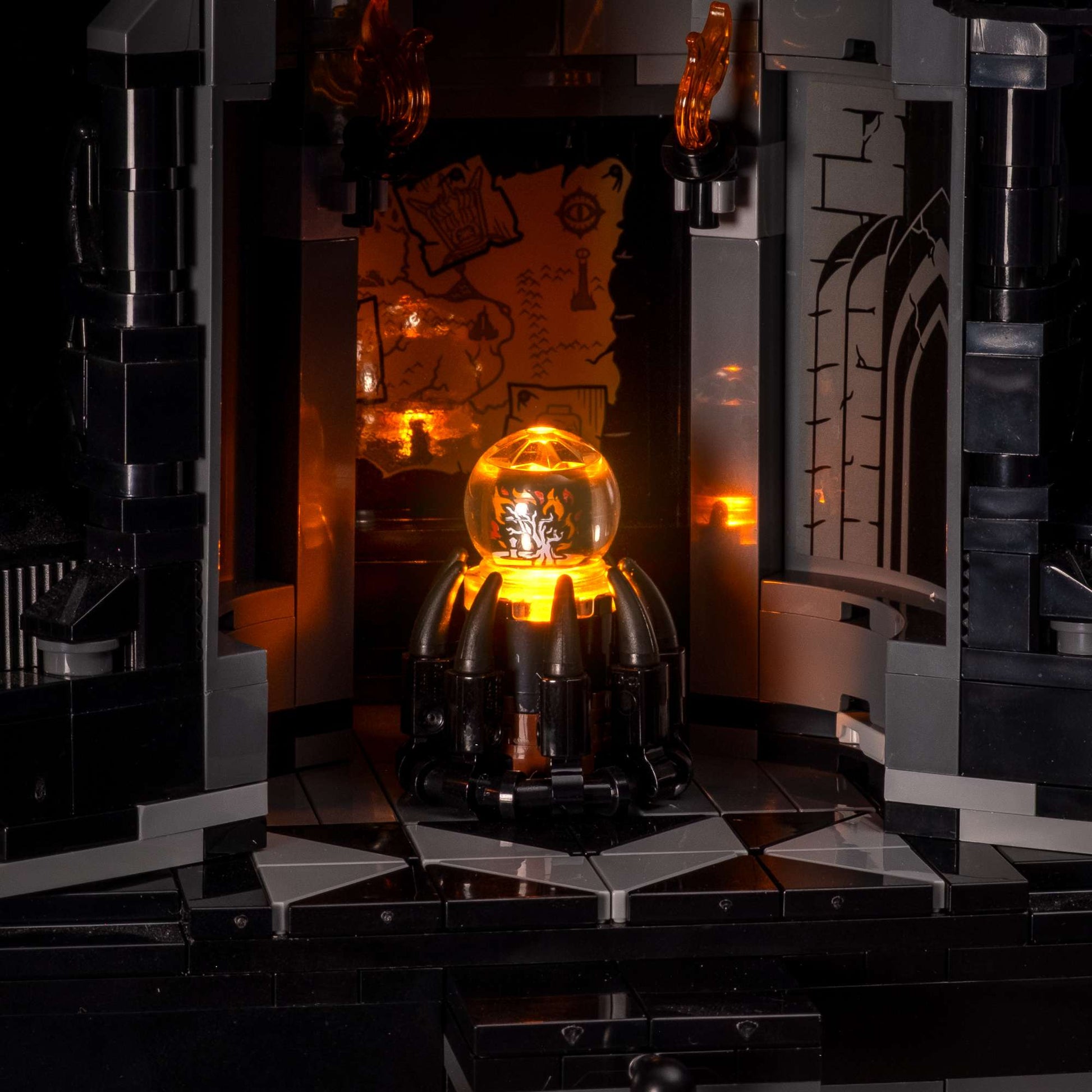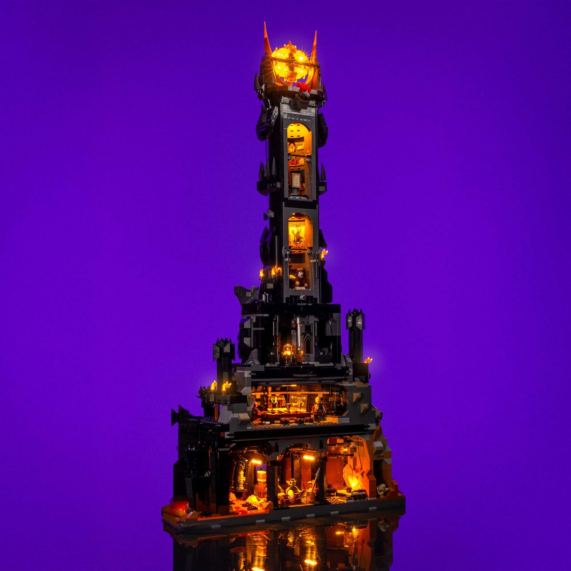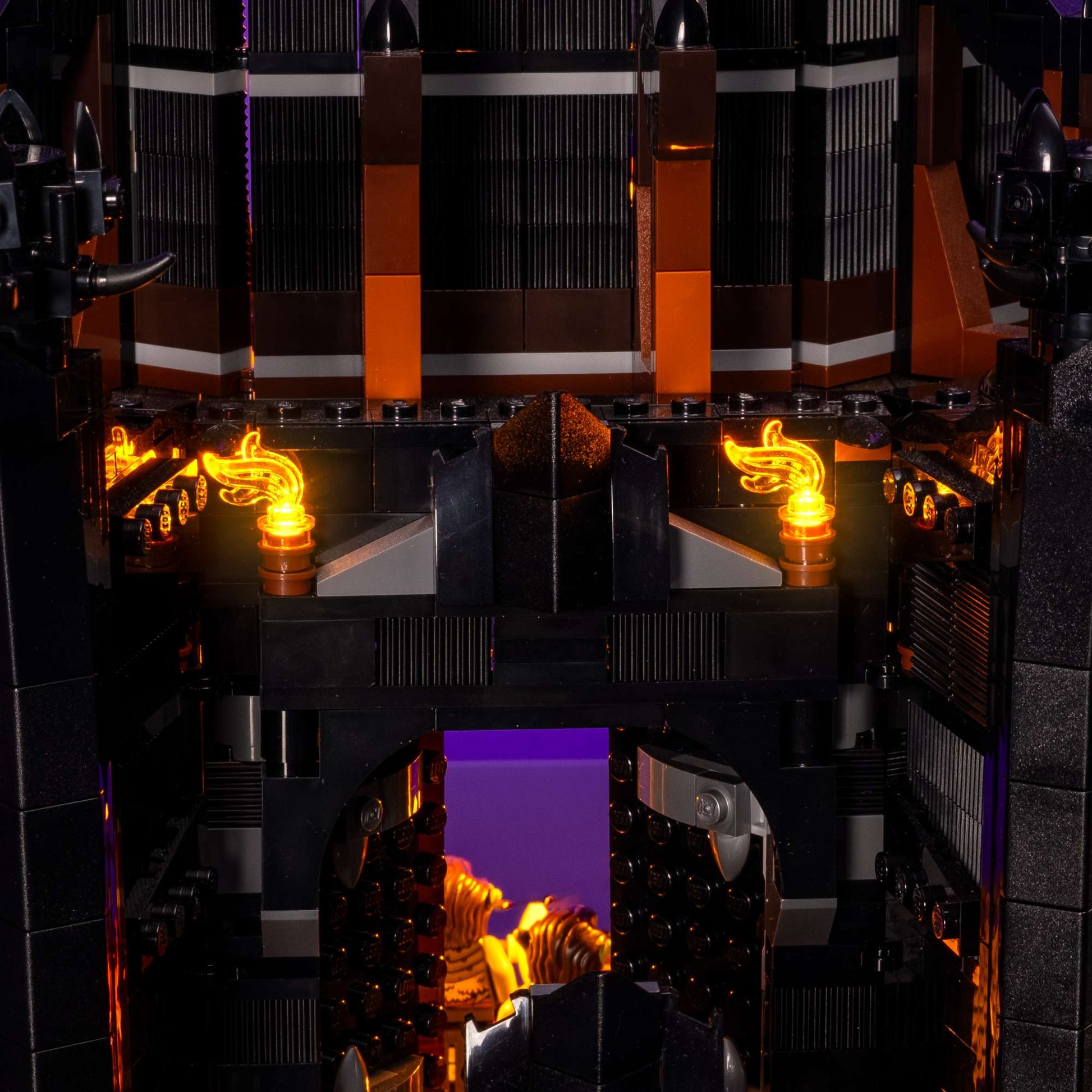 29 individual lights have been carefully designed to capture the details of the ominous fortress. Some of our favourite features are the 8 lights we've placed around the base, to bring the lava to life, and a whopping set of 11 flickering lights designed emulate the candles and torches that placed around the tower.