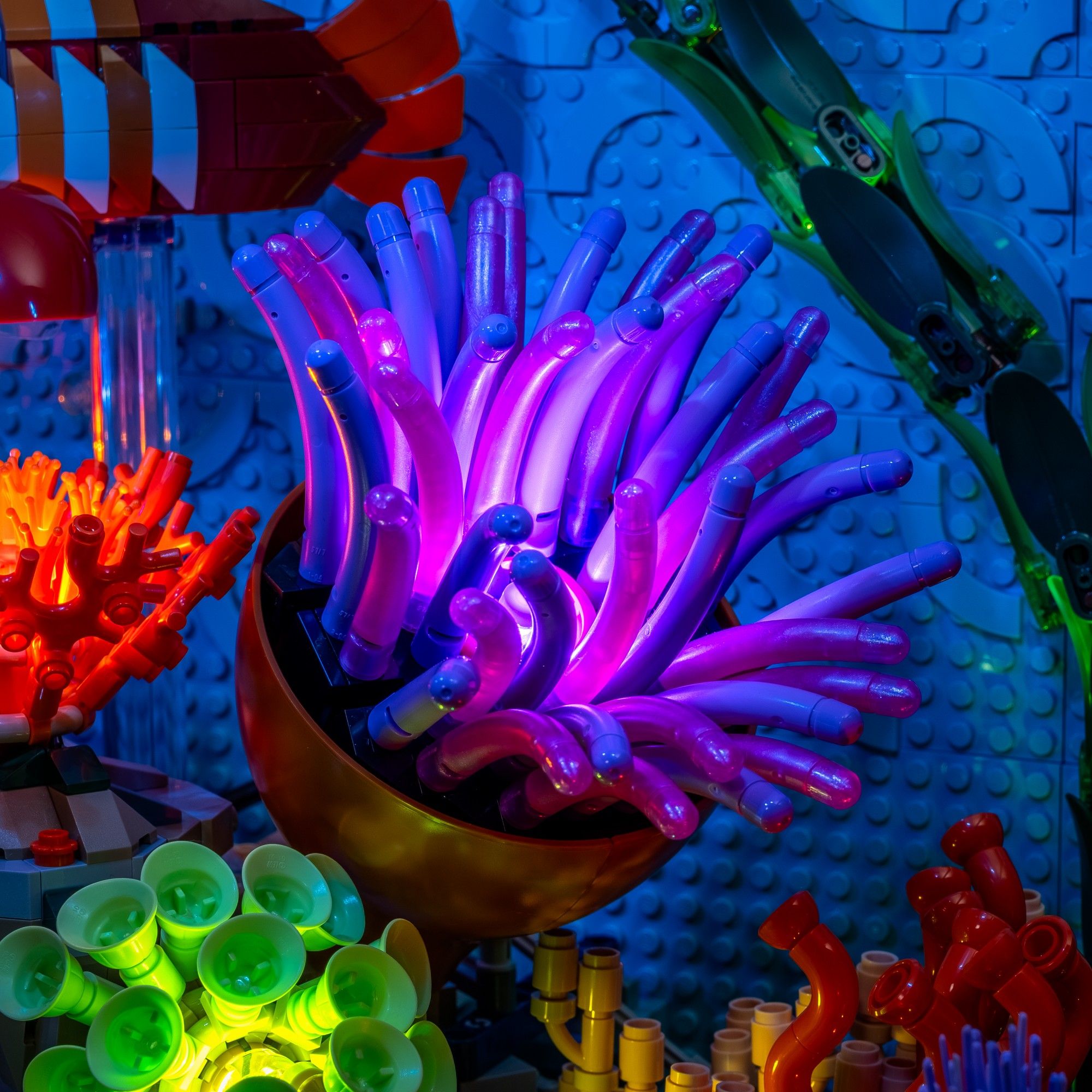 Dive into a mesmerising underwater world with a Light My Bricks™ Light Kit for the LEGO® Tropical Aquarium 10366, where every coral, creature and hidden detail glows with vibrant colour. Light blue meteor lighting creates a bright daytime tank effect that can be switched off to reveal a glowing nightlife display of marine life. From warm white illumination on the tan coral to vivid orange, red, green, blue, violet and pink Astro Lights placed throughout the reef, each formation shines with its own unique character. The treasure chest bursts with golden light, the purple tendrils radiate violet tones and the green seaweed bundles gently pulse to mimic a natural wave effect, transforming this aquarium into a living seascape. With support for adding a Remote Board or FX Spectrum by swapping the included belt extender, your aquarium can become fully customisable and even more immersive.