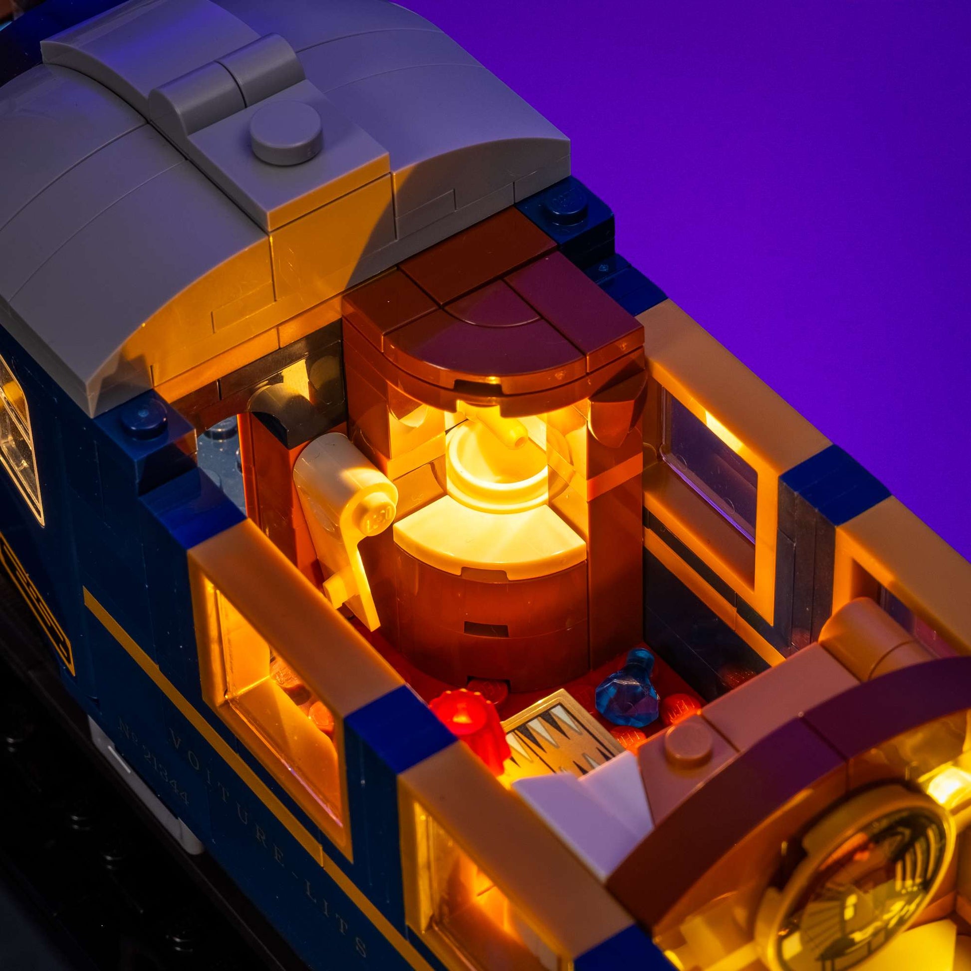 Relive the golden age of luxury travel with a custom Light My Bricks™ Light Kit for the LEGO® Ideas The Orient Express Train 21344, designed to capture the elegance and romance of the world’s most famous railway journey. Warm white headlights and a glowing lantern guide the locomotive forward, while a red-lit furnace keeps the steam engine alive with cinematic realism. Inside the carriages, table lamps, bedrooms, and bar areas glow with soft yellow and warm white lighting, creating a welcoming atmosphere for passengers on their long voyage. Finished with glowing carriage ends, track spotlights, and an authentic red tail light, this kit transforms the Orient Express into a dazzling display piece worthy of its legendary name.